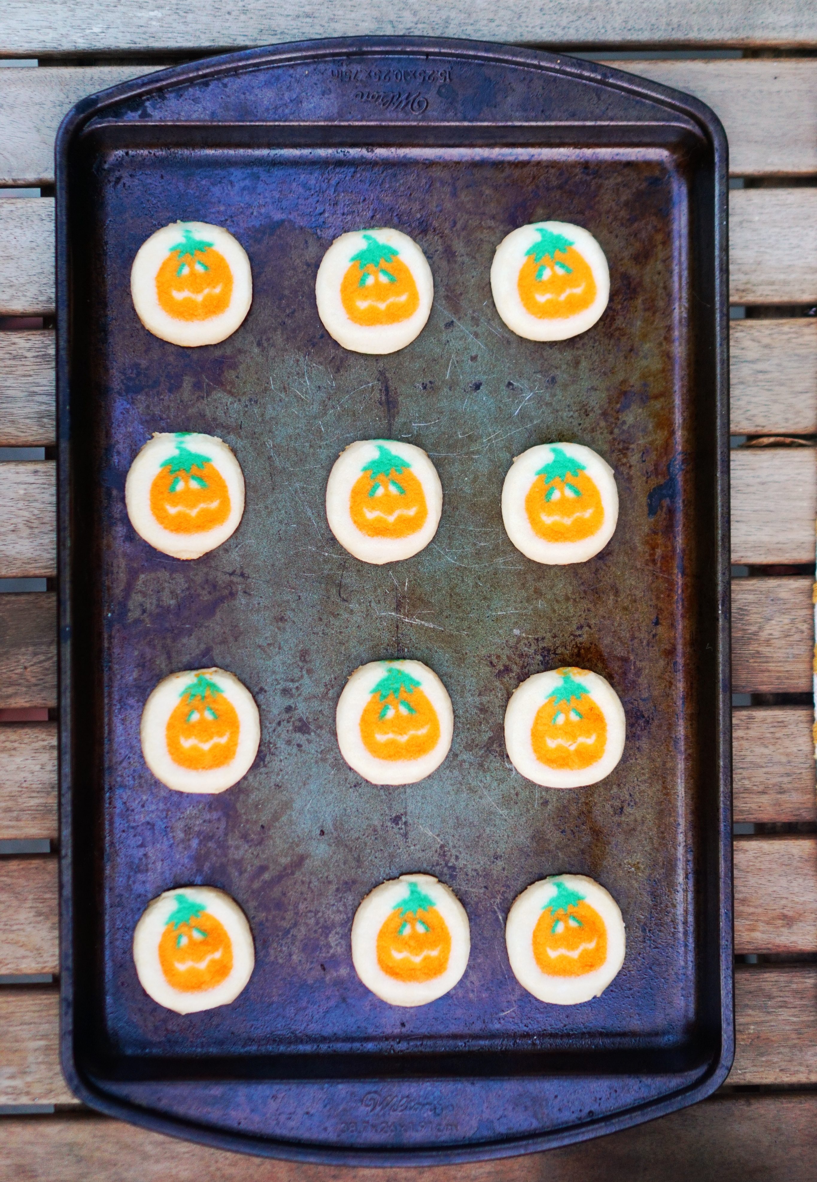 We made use of our backyard table yet again to make these cute little pumpkin cookie sandwiches. Simply make Pillsbury Ready to Bake!™ Pumpkin Shape™ Sugar Cookies, frost the backside of one, and press together. Just add sprinkles!